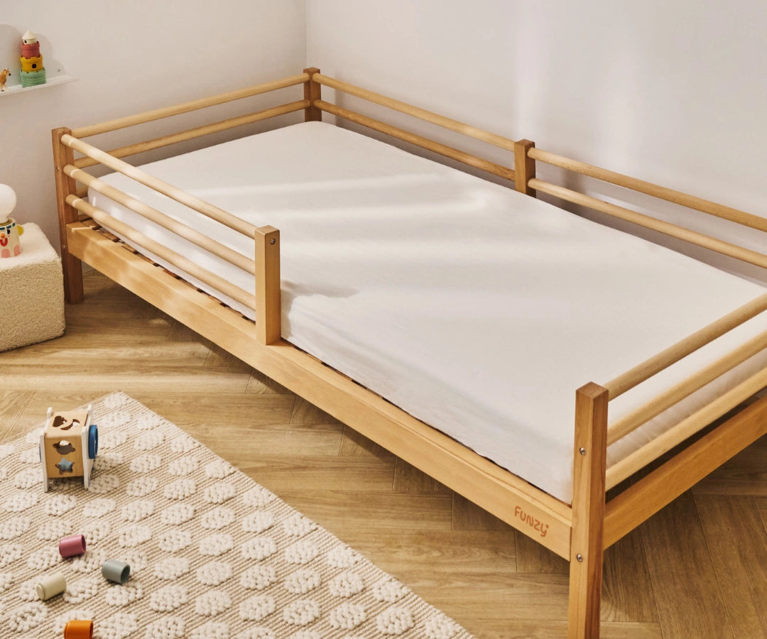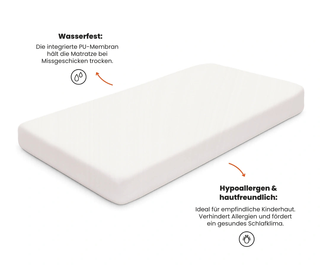 Das Funzy Spannbettlaken schützt die Matratze zuverlässig vor Flüssigkeiten, kleinen Missgeschicken oder Verschmutzungen – perfekt auf die Funzy Kindermatratze ↗ abgestimmt. Dank der PU-Membran ist es 100 % wasserdicht, gleichzeitig atmungsaktiv und angenehm weich auf der Haut. Das Laken ist hypoallergen und hautfreundlich, ideal für empfindliche Kinderhaut, und lässt Luft zirkulieren, sodass ein gesundes Schlafklima erhalten bleibt.